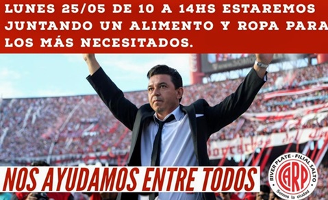 La Filial de River Plate en Salto ha comenzado una colecta solidaria para ayudar a quienes más lo necesitan. Al respecto dialogamos con el secretario de la Filial, Lucas Gutierrez, quien nos amplió sobre el tema. "El 25 de mayo es el cumpleaños de River por lo que hay una gran movida de las filiales, y como no se puede festejar, surgió la idea de realizar una campaña solidaria" dijo; agregando que desde hace una semana lo están publicando y mucha gente ya ha realizado una importante cantidad de donaciones que, pluego de ser clasificadas, serán repartidas a las personas más carenciadas. "Hemos hablado con gente del municipio para que nos digan quiénes son las personas más necesitadas" expresó.