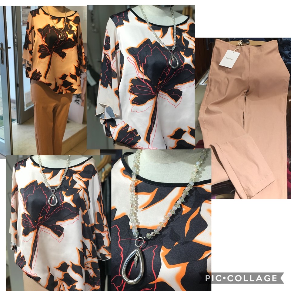 Hoy en su micro Femme nos presenta su nueva temporada otoño-invierno con un conjunto de mucha tendencia pero muy amortizable y que se puede combinar fácilmente con otras prendas. Ademas si bien el mismo es para la época que se avecina el modelo y los colores son clásicos que los usaremos siempre y que se prestan para cualquier ocasión, incluso para llevar un día de calor como el de hoy. El look de hoy esta pensado para una salida mas arreglada o formal que puede ser tanto diurna como nocturna y se compone de: -una blusa de satén de fondo beige con una estampa de flores bien grande en color negro, las cuales tienen los bordes en color naranja y rojo. Las mangas son de gasa, cortas y bien amplias (tipo murciélago). Su cuello es redondo y el largo es aproximadamente a la cadera. -un pantalón de bengalina elastizada en color beige, el cual brinda muchísima comodidad para movernos. El mismo es chupin y llega al tobillo donde tiene un cierre que permite abrir o cerrar para pasar el pie y para que se luzca el calzado. La cintura es bastante alta y tiene un elástico para que nos lo pongamos como si fuera una calza. Para finalizar elegimos un collar que llega a la altura del pecho, de piedras pequeñas, transparentes y en color rosa que se mimetiza con la blusa y que finaliza en un dije en forma de gota en color plata, aunque como siempre decimos podemos optar por otro collar mas llamativo o de otro color ya que con estos tonos podemos llevar dorados, negros, naranjas,etc, y también usar otros accesorios como aros, pulseras o pañuelos (estos que sean lisos). En cuanto al calzado pueden llevar desde sandalias, chatitas, botas cortas, borceguís, etc.