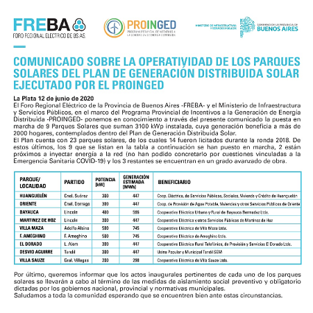 El Foro Regional Eléctrico de la Provincia de Buenos Aires -FREBA- y el Ministerio de Infraestructura y Servicios Públicos, en el marco del Programa Provincial de Incentivos a la Generación de Energía Distribuida -PROINGED- ponemos en conocimiento a través del presente comunicado la puesta en marcha de 9 Parques Solares que suman 3100 kWp instalada, cuya generación beneficia a más de 2000 hogares, contemplados dentro del Plan de Generación Distribuida Solar.
